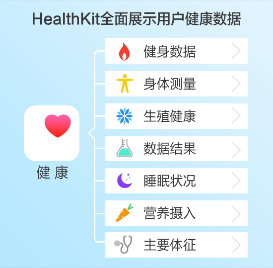 HealthKit健康平臺(tái)是蘋(píng)果2014年6月發(fā)布的一款關(guān)注用戶(hù)全方位健康的智能健康管理平臺(tái),集成了用戶(hù)健身數(shù)據(jù)、身體測(cè)量、生殖健康、數(shù)據(jù)結(jié)果、睡眠狀況、營(yíng)養(yǎng)攝入、主要體征七大類(lèi)信息,全面展示用戶(hù)的個(gè)人健康數(shù)據(jù)。同時(shí),Healthkit也是一個(gè)面向第三方的開(kāi)放式軟件平臺(tái),它提供數(shù)據(jù)存儲(chǔ)和整合分析服務(wù),用戶(hù)可以通過(guò)智能硬件獲取體能生理數(shù)據(jù),同步至HealthKit平臺(tái)進(jìn)行整合分析。