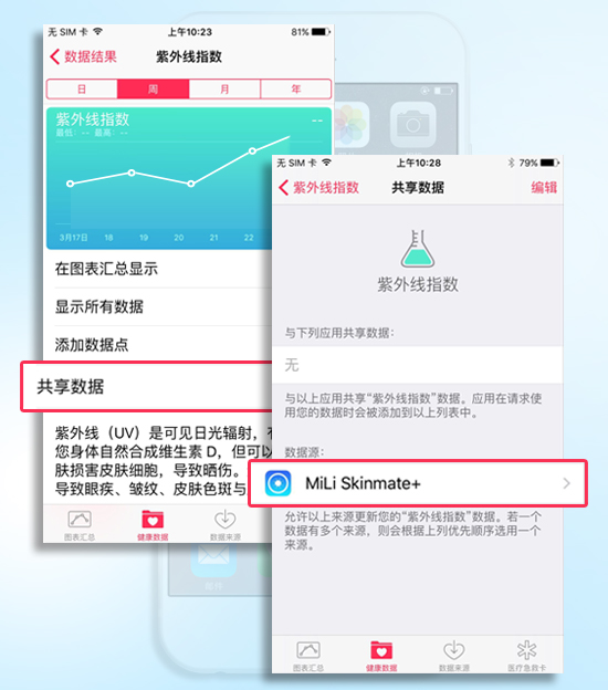 MiLi Skinmate+不僅能與自帶的App無(wú)線(xiàn)連接使用,檢測(cè)到的紫外線(xiàn)指數(shù)數(shù)據(jù)還能直接同步到蘋(píng)果的HealthKit健康平臺(tái)中,使紫外線(xiàn)數(shù)據(jù)與更多更全面的健康數(shù)據(jù)進(jìn)行整合,用戶(hù)只需打開(kāi)蘋(píng)果HealthKit平臺(tái)即可看見(jiàn)所有健康數(shù)據(jù),全面了解自身健康狀況。