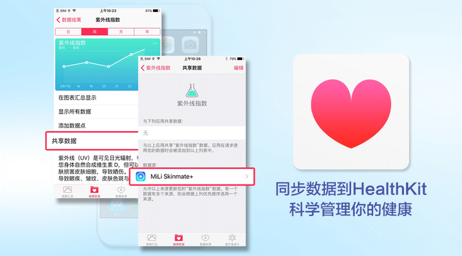 MiLi Skinmate檢測到的紫外線數(shù)據(jù),可以同步更新到HealthKit,兩者協(xié)助全方位管理你的健康。